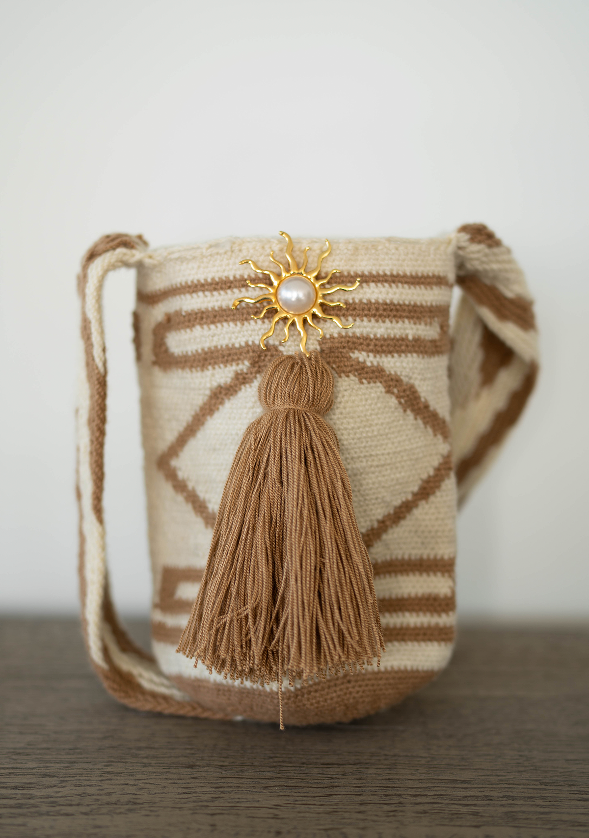 Solara — A medium Cancuama bag in alpaca wool with symbolic pin and flowing fringes, designed to honor ancestral craftsmanship with warmth and character.